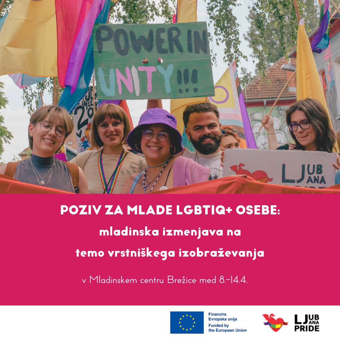 Poziv za mlade LGBTIQ+ osebe: mladinska izmenjava na temo vrstniškega izobraževanja Društvo Parada ponosa išče mlade LGBTIQ+ osebe stare med 18 in 29 let, ki bi sodelovale_i na mladinski izmenjavi na temo vrstniškega izobraževanja, ki bo potekala v Mladinskem centru Brežice med 8.-14.4. Če si mlada LGBTIQ+ oseba, ki želi s svojimi vrstnicami_ki […]