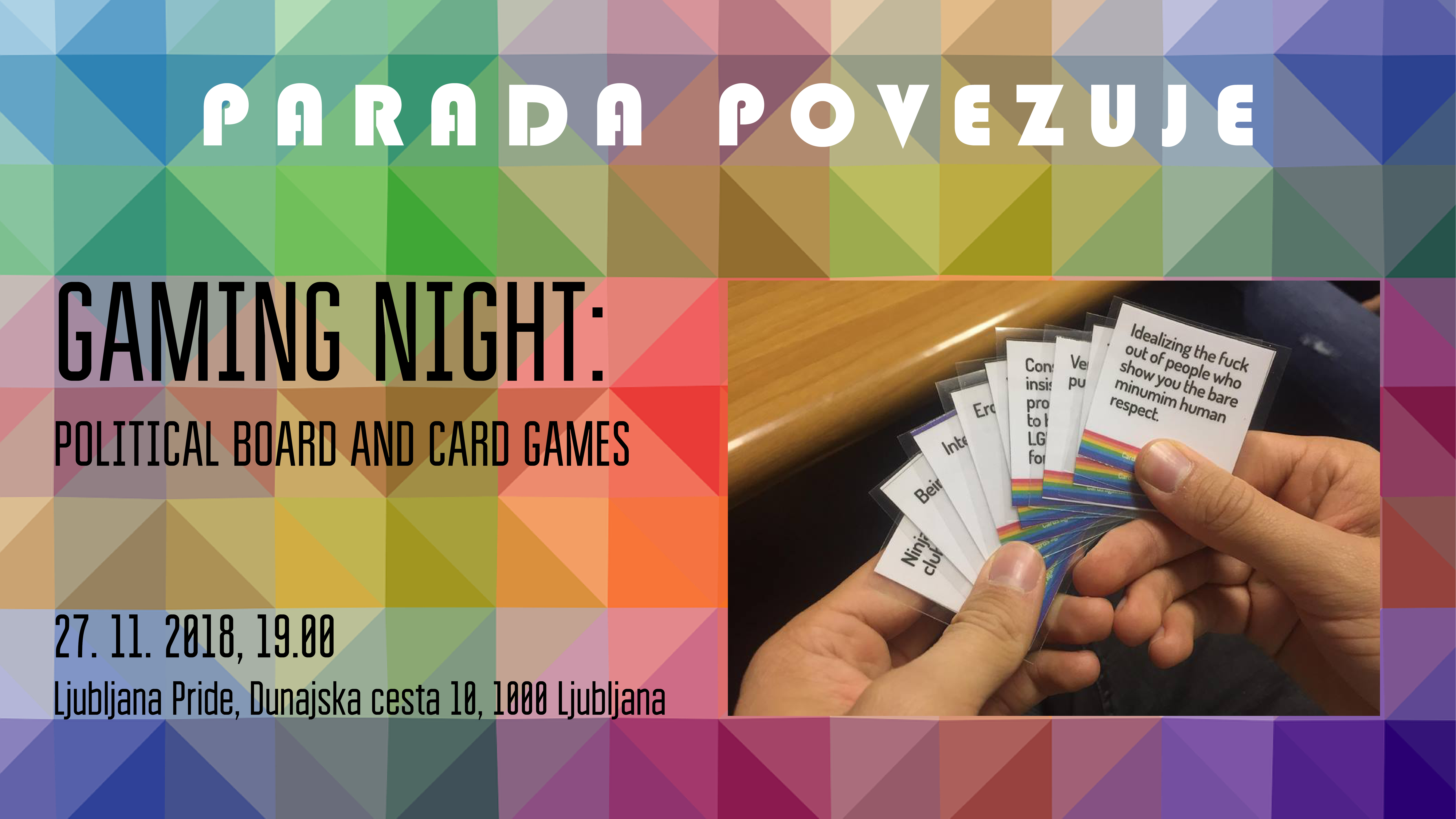 Čas je za večer igranja iger! Skozi čas smo pri Društvu Parada ponosa zbrale_i več iger, obarvanih s politično noto! Od namiznih iger do iger s kartami. Njihova vsebina bo zagotovo poskrbela za unikatno igralno izkušnjo.