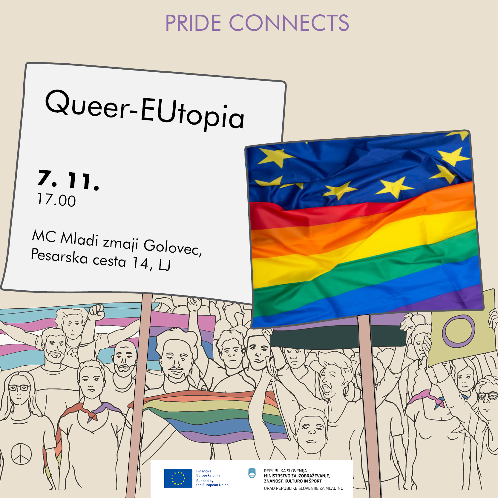 Vabljene_i na naslednjo aktivnost Pride Connects, Queer-EUtopia, kjer bomo nadaljevali temo in pristop prejšnje aktivnosti: predstavljajte si, kako bi izgledala utopična družba, obarvana v barvah LGBTIQ+ oseb.